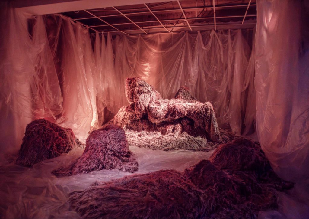 The “Pre-Construction” room was shrouded in darkness and contained an interactive installation with 20 large fur sculptures of different sizes, which were individually designed by coloring and changing the texture of the fur. They were interwoven with materials such as transparent nylon, as used to protect walls during painting. The mixture of tactile and raw elements created a dramatic, theatrical atmosphere that aimed to create a sense of spiky hospitality. The space was dedicated to intimate conversations on topics such as self-defense, East-West relations and fundraising.