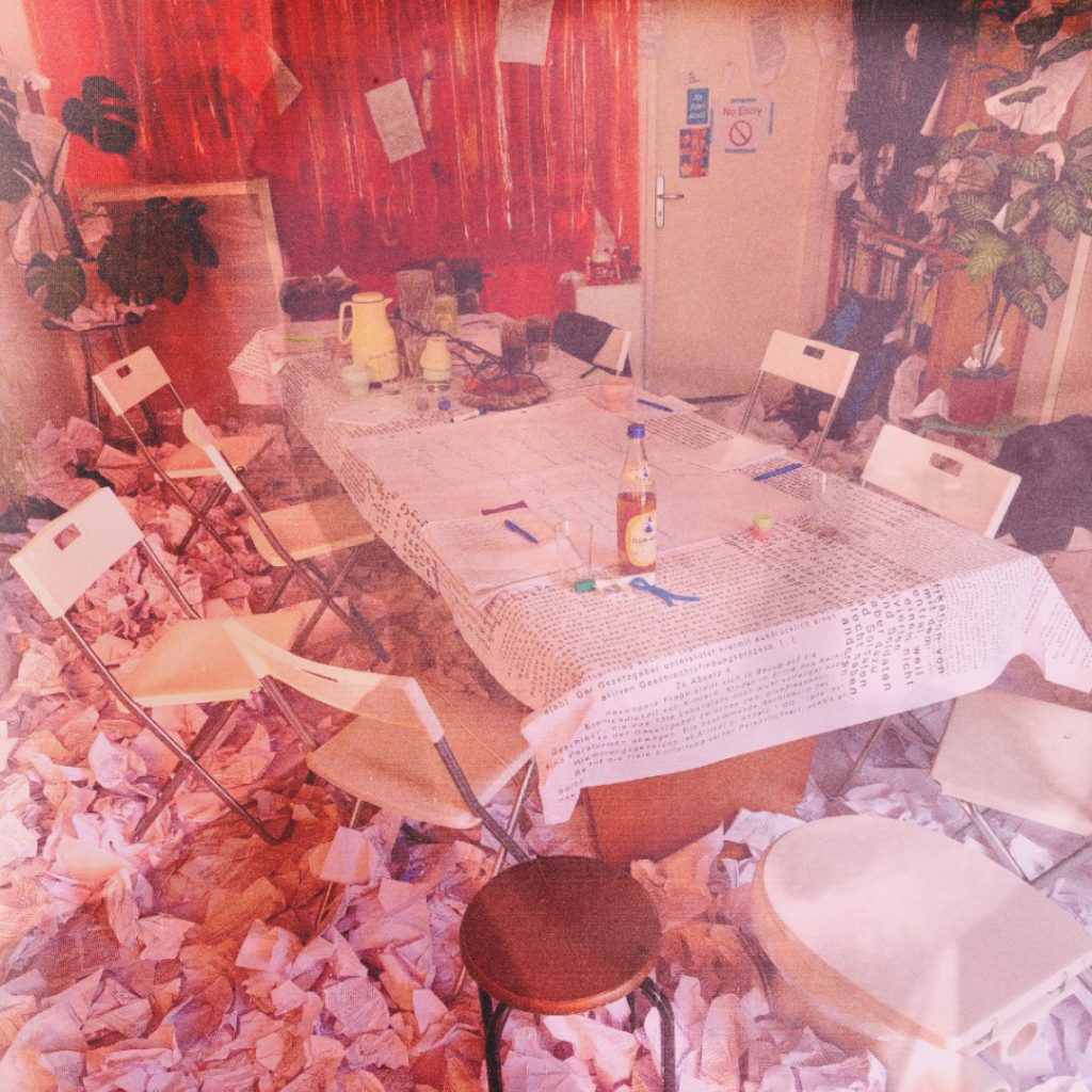 The “Conference Haus” was filled with 7,800 pages of printouts of the German government’s self-determination law, creating a sense of chaos and disorder. The room also contained a large table with the alternative law written by “Selbstbestimmung Selbst Gemacht” (SBSG) adorning the tablecloth. Otherwise, the room was left in its original state, with all the details from before the conference. It also served as the company kitchen. This artistic installation, together with an audio documentation of the Self-Determination Act, was also on display at the Queer Museum in Vienna, Austria, in the fall of 2024.