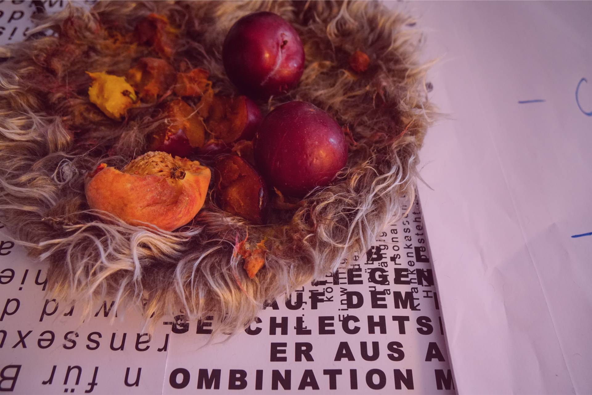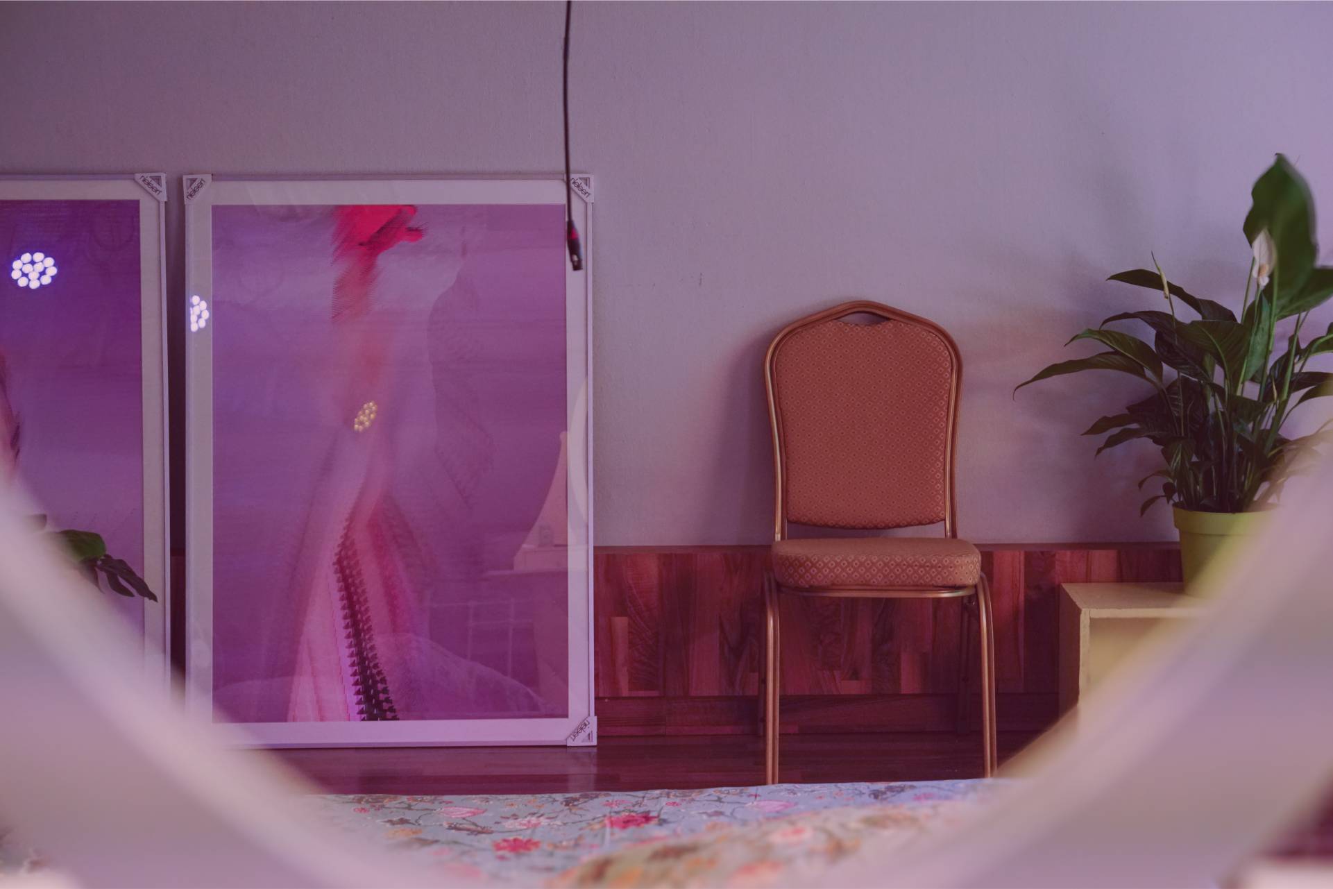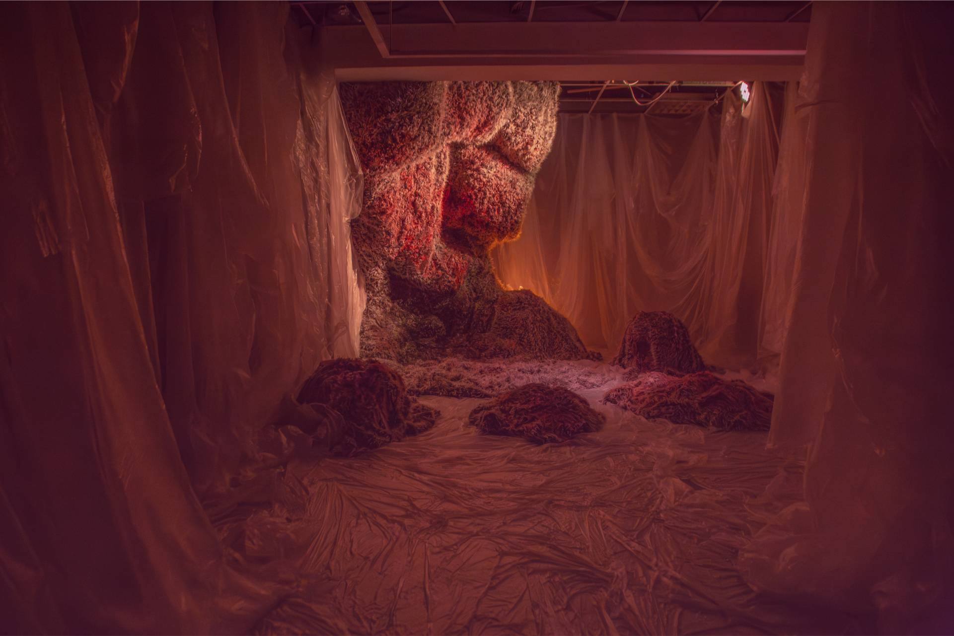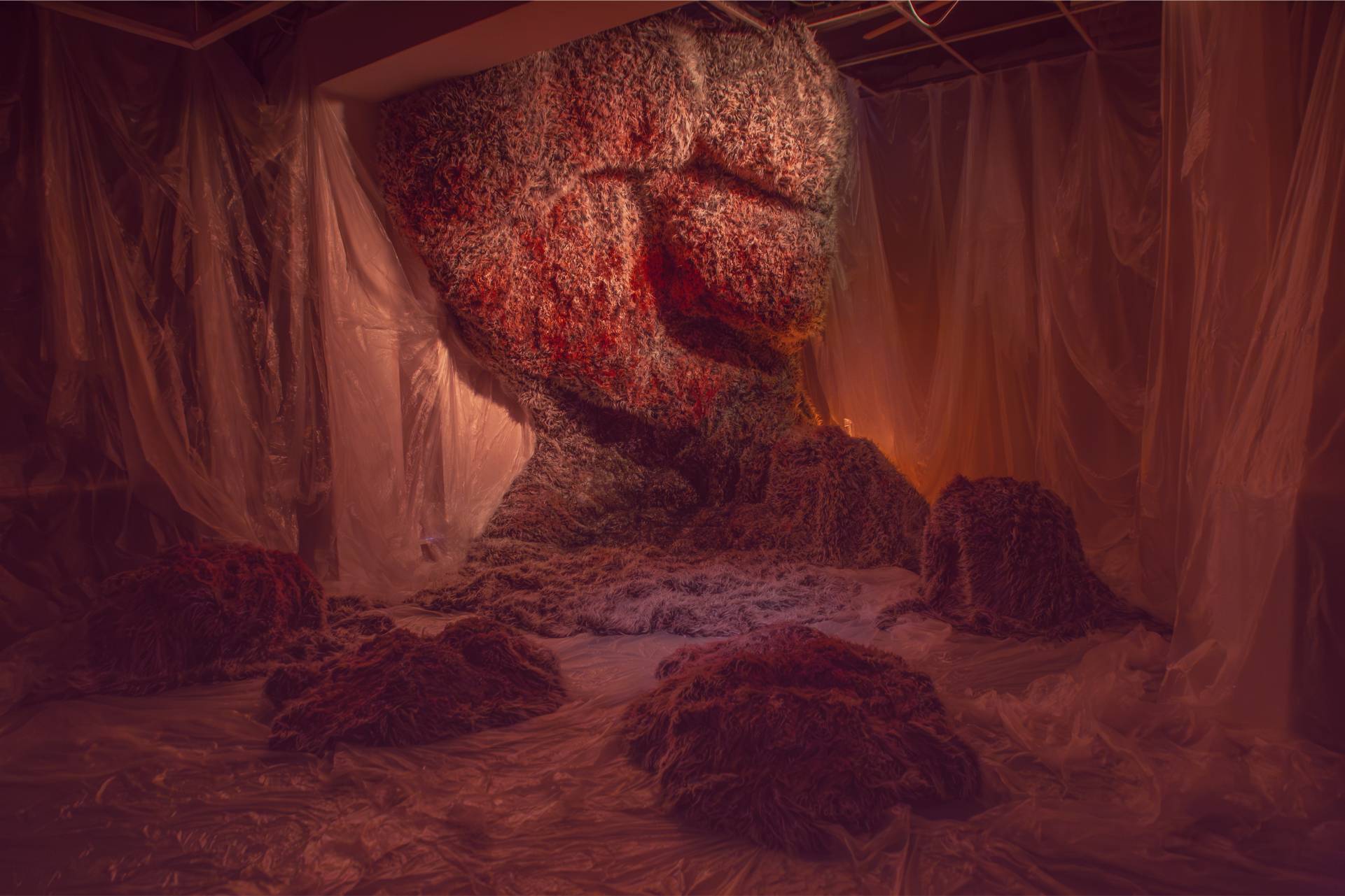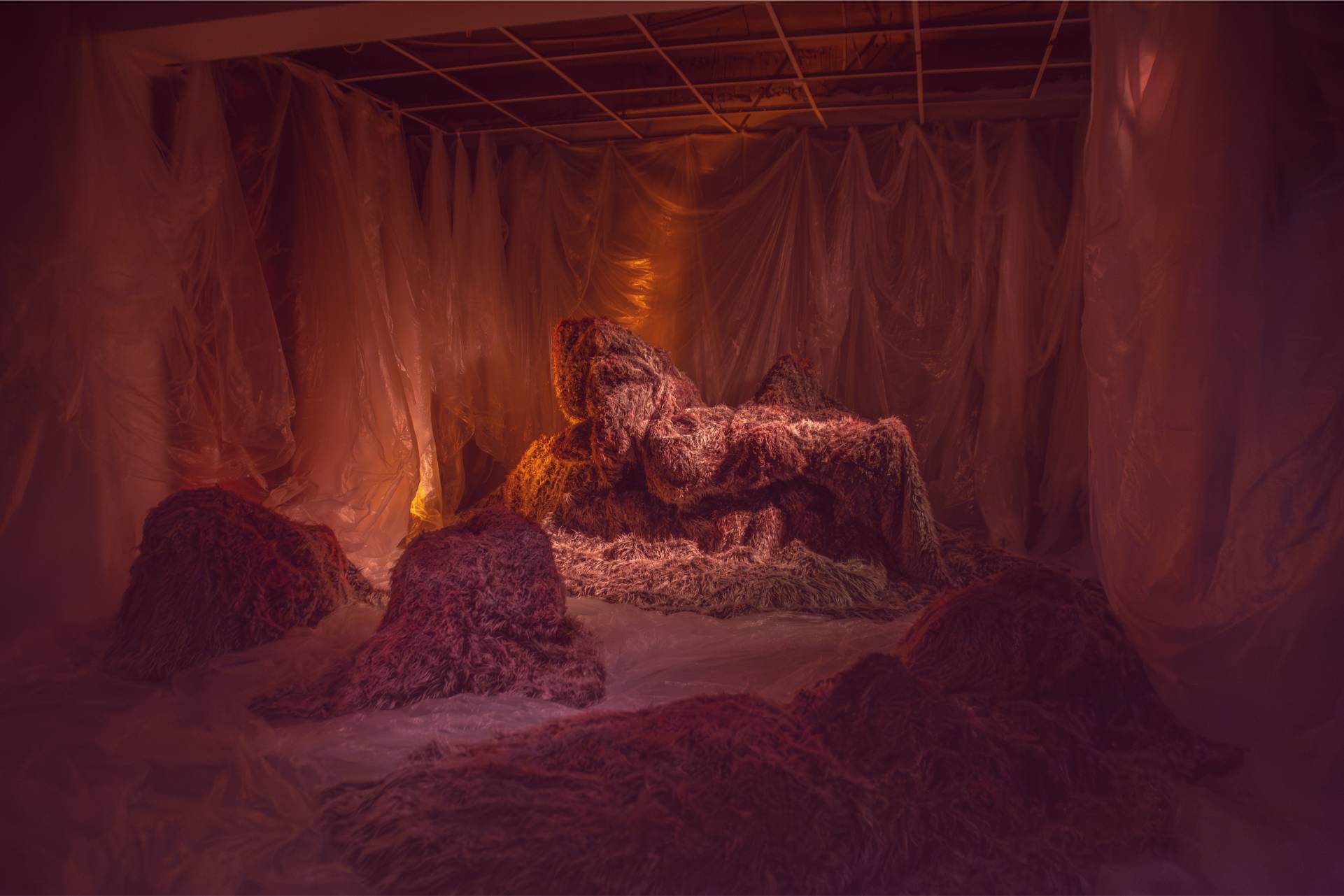 The “Pre-Construction” room was shrouded in darkness and contained an interactive installation with 20 large fur sculptures of different sizes, which were individually designed by coloring and changing the texture of the fur. They were interwoven with materials such as transparent nylon, as used to protect walls during painting. The mixture of tactile and raw elements created a dramatic, theatrical atmosphere that aimed to create a sense of spiky hospitality. The space was dedicated to intimate conversations on topics such as self-defense, East-West relations and fundraising.
