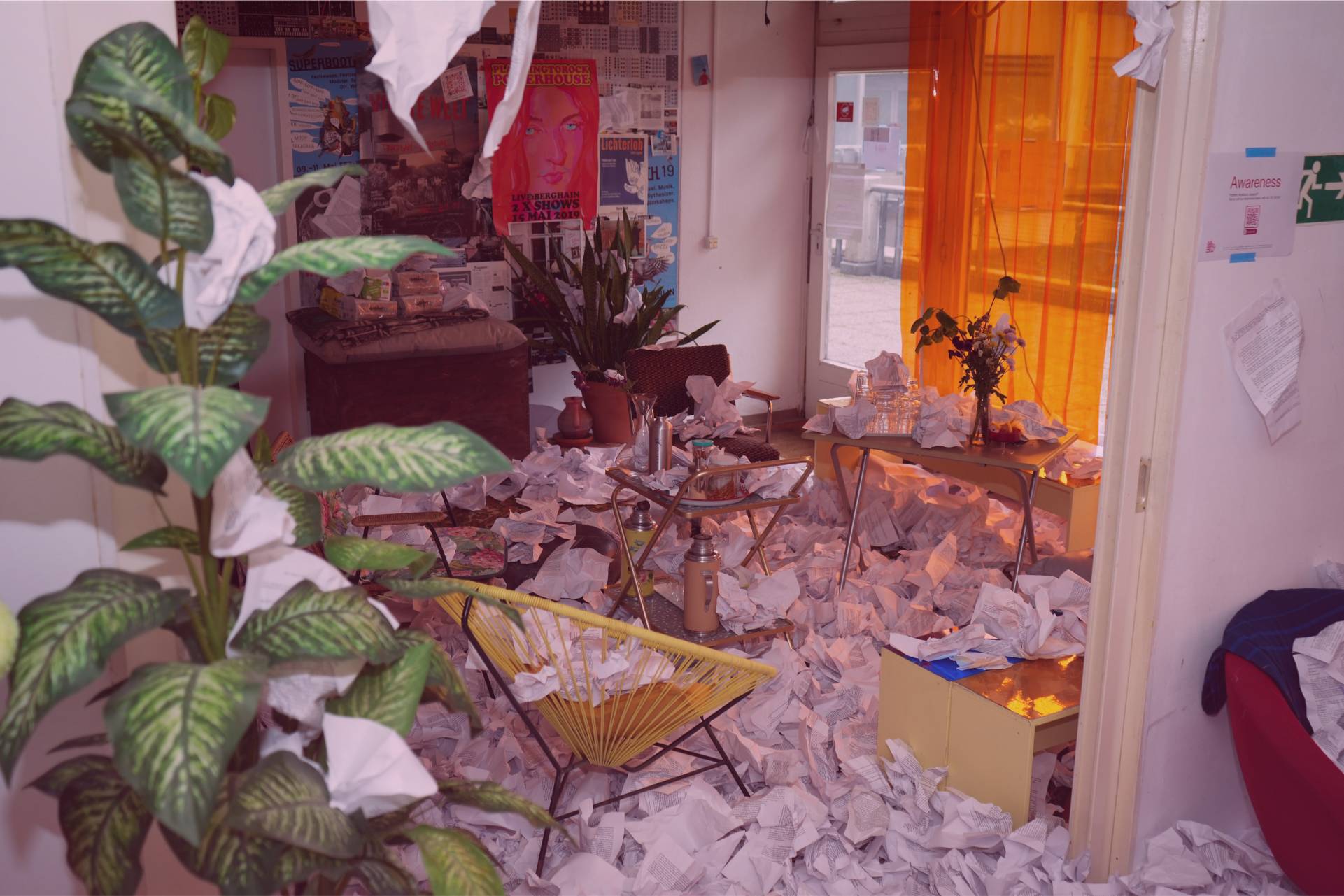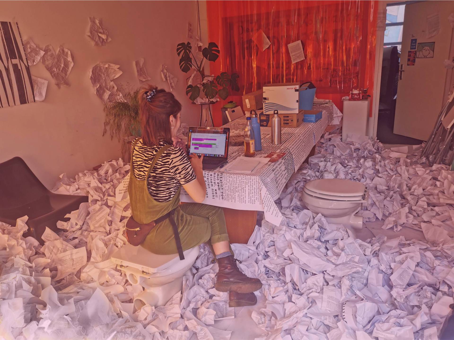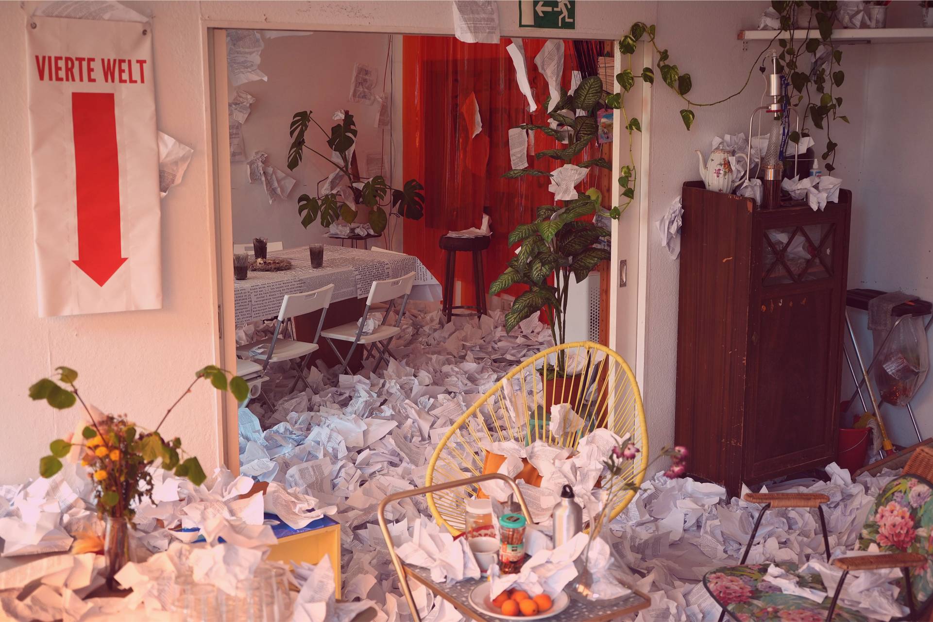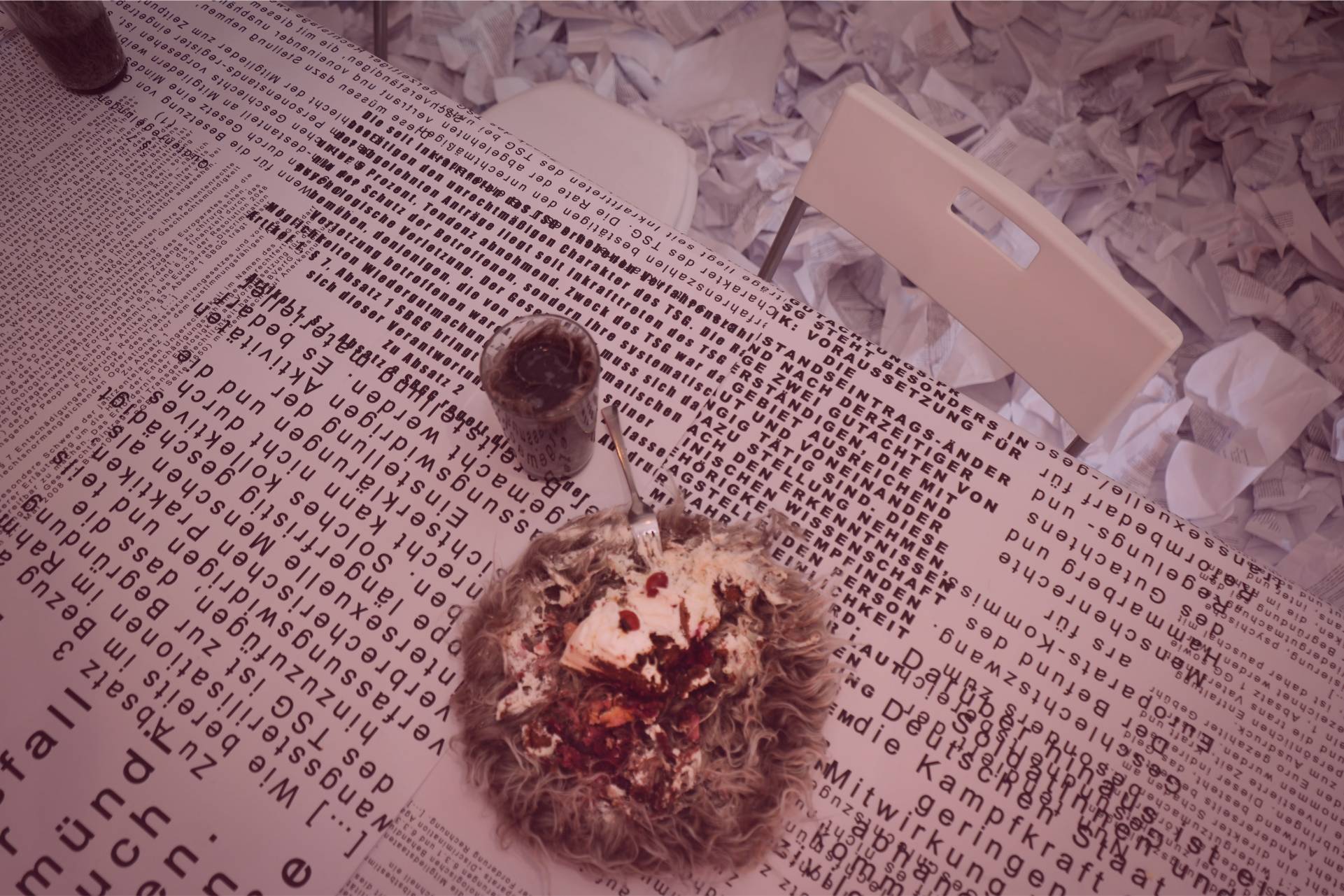 The “Conference Haus” was filled with 7,800 pages of printouts of the German government’s self-determination law, creating a sense of chaos and disorder. The room also contained a large table with the alternative law written by “Selbstbestimmung Selbst Gemacht” (SBSG) adorning the tablecloth. Otherwise, the room was left in its original state, with all the details from before the conference. It also served as the company kitchen. This artistic installation, together with an audio documentation of the Self-Determination Act, was also on display at the Queer Museum in Vienna, Austria, in the fall of 2024.