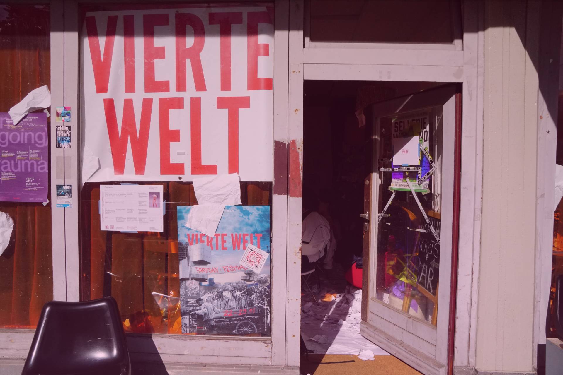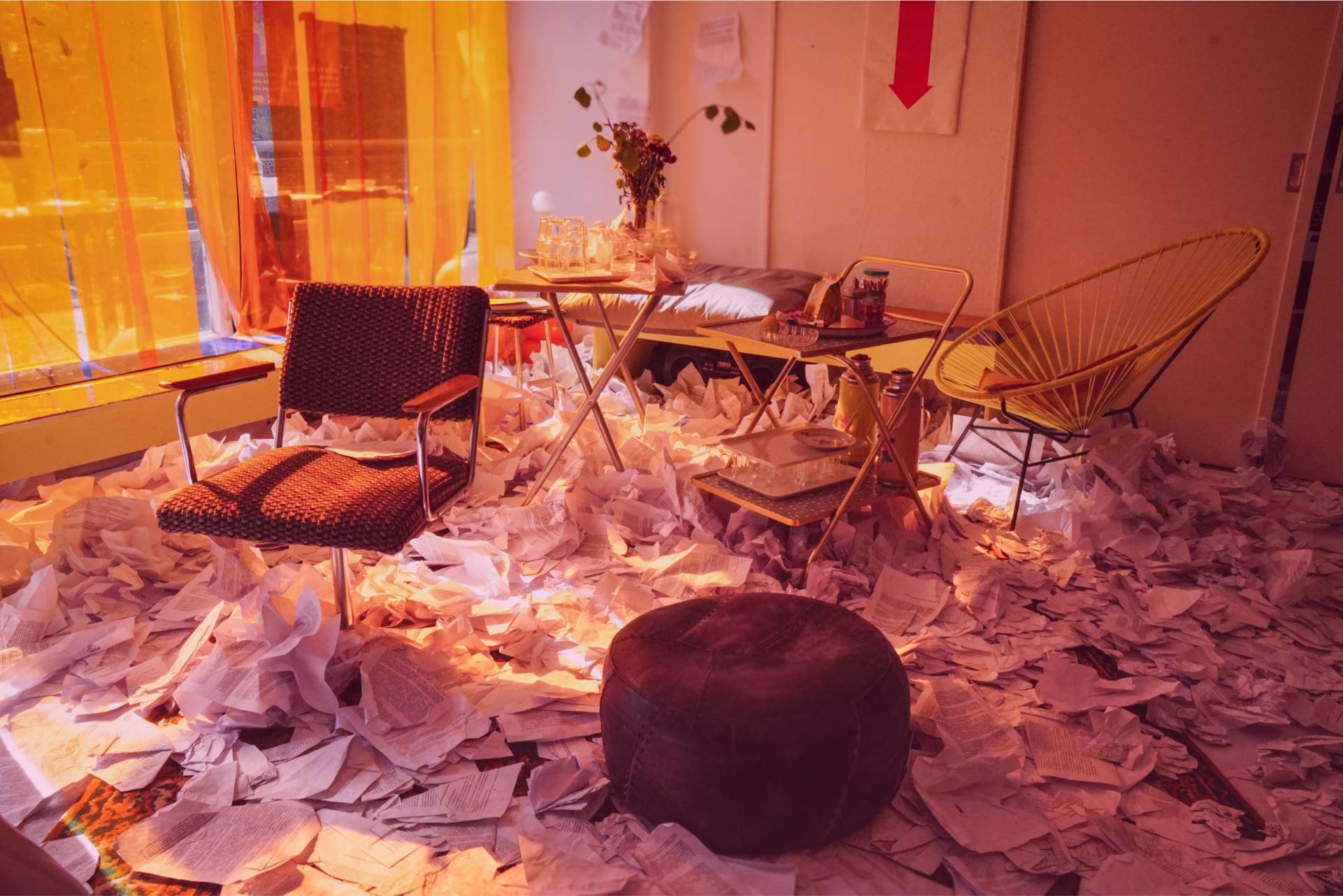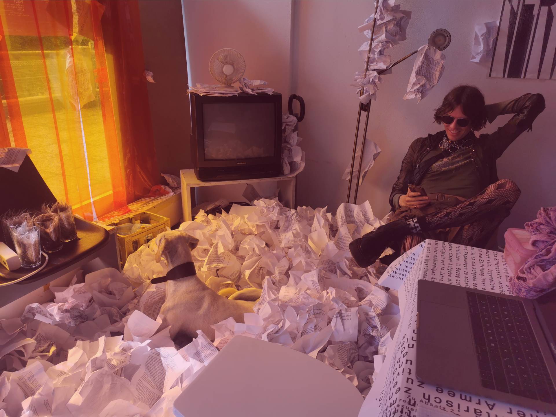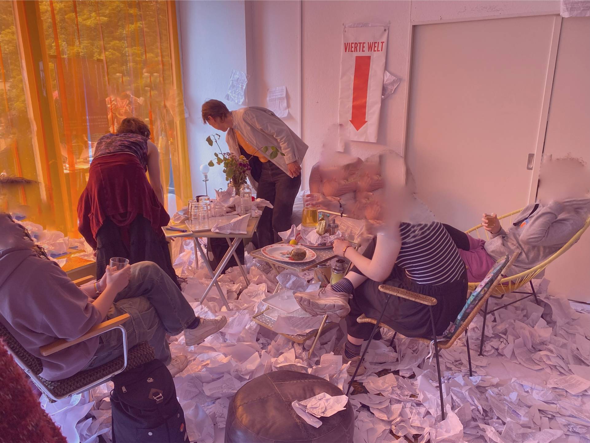 The “Conference Haus” was filled with 7,800 pages of printouts of the German government’s self-determination law, creating a sense of chaos and disorder. The room also contained a large table with the alternative law written by “Selbstbestimmung Selbst Gemacht” (SBSG) adorning the tablecloth. Otherwise, the room was left in its original state, with all the details from before the conference. It also served as the company kitchen. This artistic installation, together with an audio documentation of the Self-Determination Act, was also on display at the Queer Museum in Vienna, Austria, in the fall of 2024.