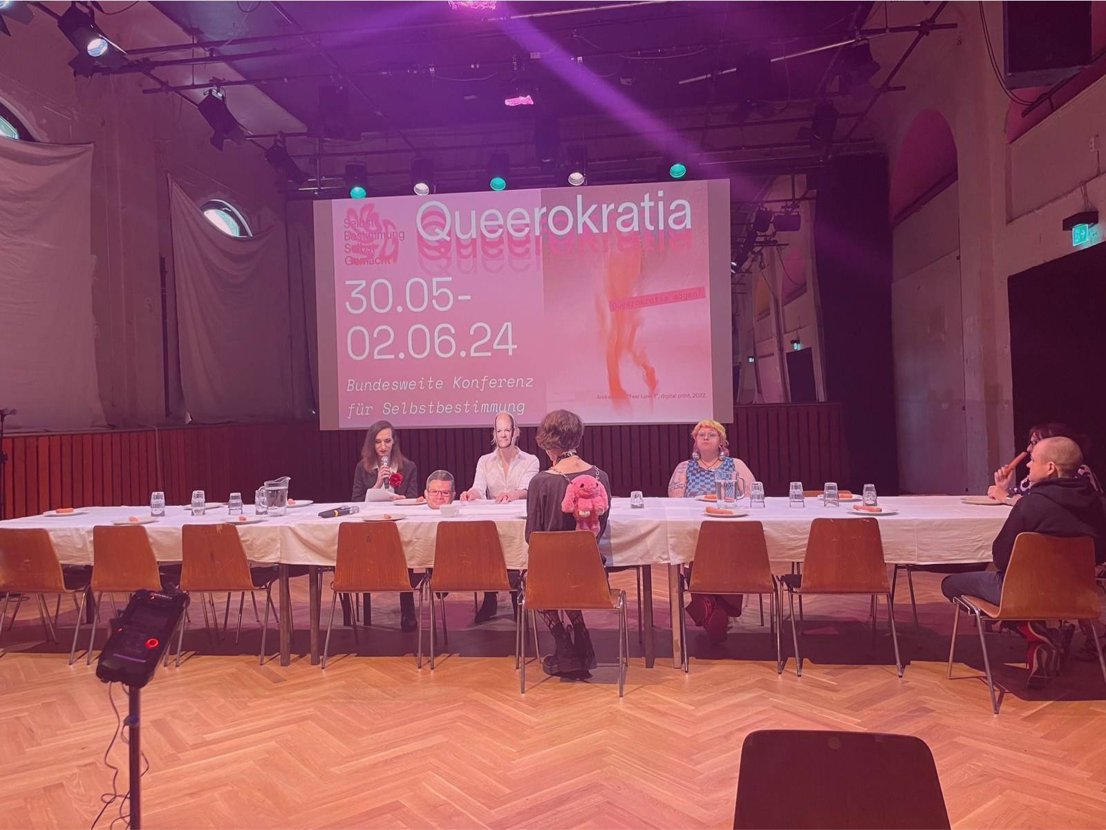 On the last day, we returned to the Ballhaus. There was a long table set on the stage for about 15 people, each with a white plate and a carrot. What would it look like, the optimal outcome of a strategy conference on TIN* policy? It would be nice if our political representatives could listen to us. That’s why then chancellor of Germany Olaf Scholz sat on stage wearing a mask. He gave a short speech in which, among other things, he declared euphoria to be a Staatsräson. The entire Ballhaus statement can be found here [link]. This speech was followed by a report on Queerokratia by the head of the Chancellor’s Office. Everyone present was then invited to sit down at the table, eat a carrot and present their concerns and suggestions to our Chancellor. Olaf said yes to everything. Although hesitant at first, more and more participants soon joined Olaf at the table to tell him, sometimes friendly, sometimes angrily, what they thought of him and of current TIN* policies. After about 45 minutes, the audience staged a riot: nobody wanted to talk to the elected representatives any more. Olaf was asked to leave the stage – and did so immediately. The participants then rearranged the stage. Suddenly, most attendees had moved on stage and everyone talked about what was next for them politically, followed by a short feedback round regarding the conference. From our perspective, this takeover was a big success. For Queerocracy is collective self-determination, as opposed to the individual self-determination proposed by the federal government in its law. And a collective uprising that asks the chancellor to leave the stage and take a seat himself is definitely a step in the right direction.