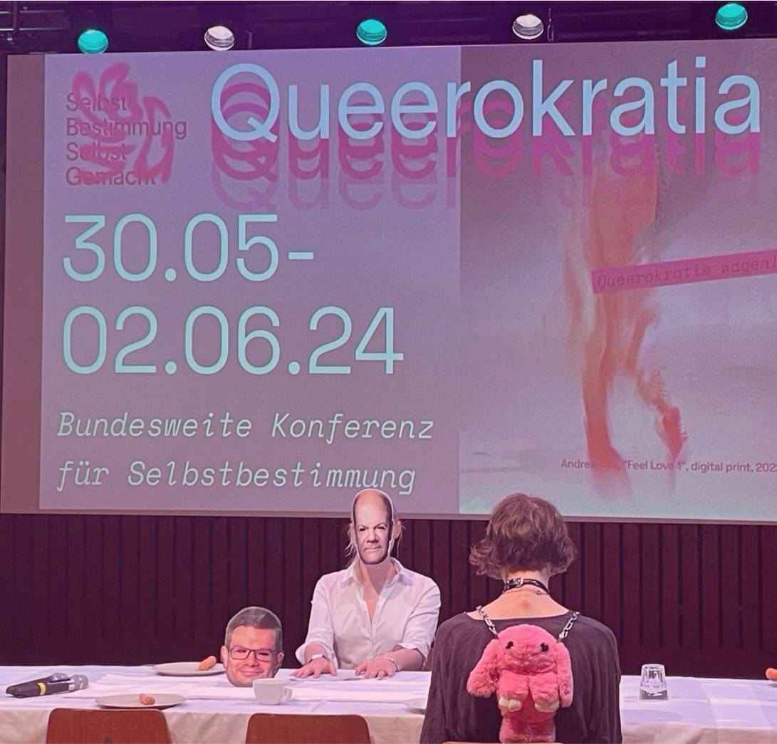 Queerokratia was a political-aesthetic conference that took place in Berlin from May 30 to June 2, 2024. It was funded by the Hauptstadtkuturfonds. The conference aimed to bring together activists, politicians and artists to discuss what progressive queer politics can look like today. Over 100 activists and NGO workers were invited, as well as artists and a few private individuals. It was a conference of multipliers under a common question: What is TIN* politics in the post-TSG era?