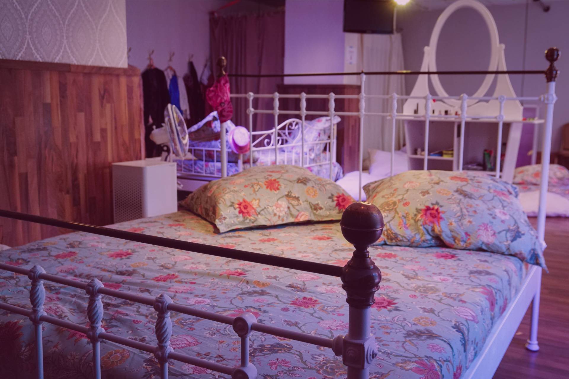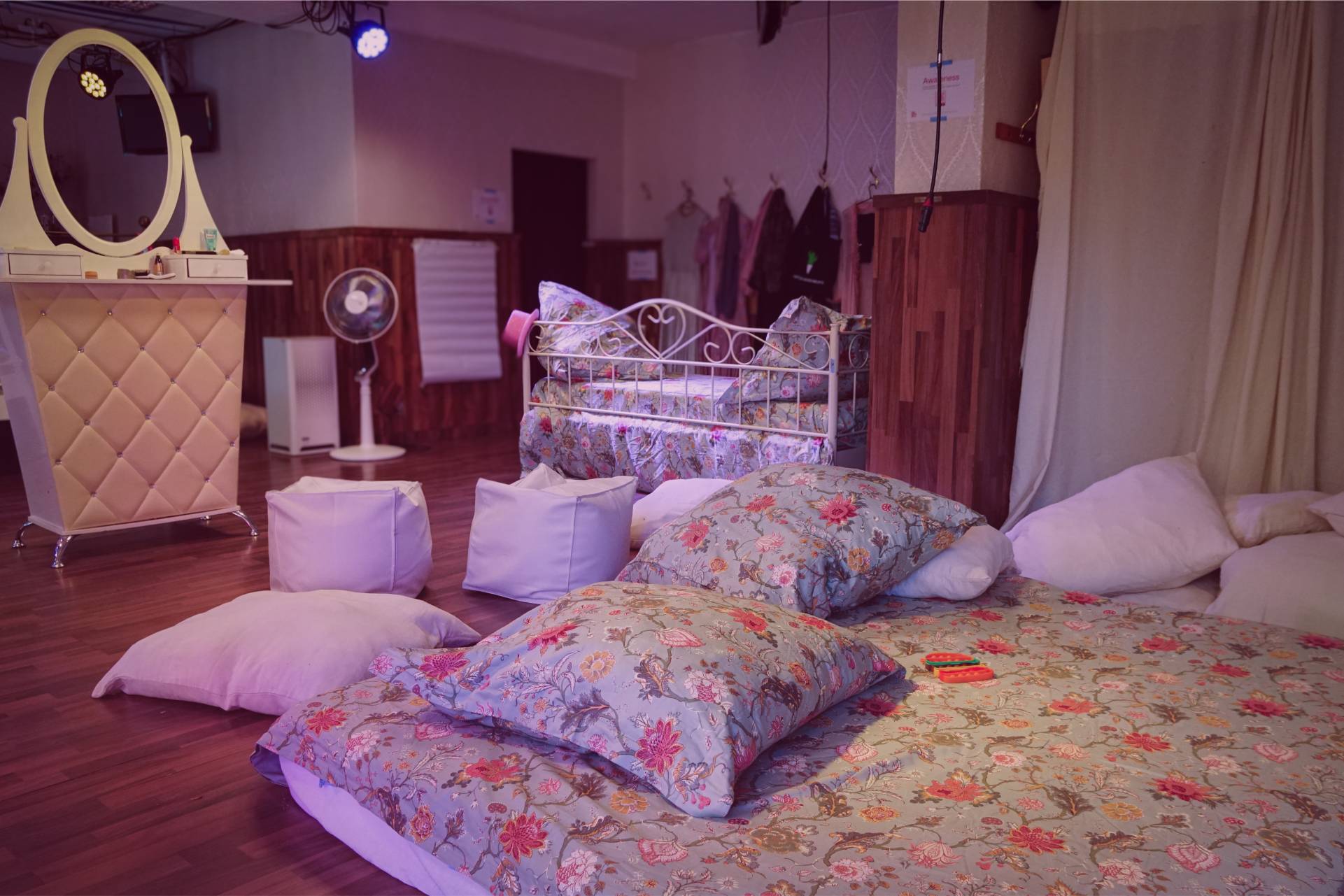 The ‘bedroom’ was furnished with three double beds surrounding a large dressing table. The room had a personal, intimate feel and was filled with personal items such as makeup and clothing of the dialog leaders. This setting encouraged discussions about general political strategies that remained both open and private thanks to the close proximity between participants.